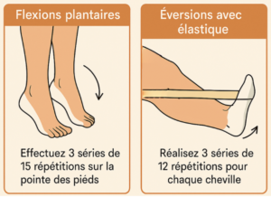 - Éversions avec élastique : Réalisez 3 séries de 12 répétitions pour chaque cheville
