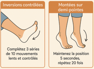 - Montées sur demi-pointes : Maintenez la position 5 secondes, répétez 20 fois